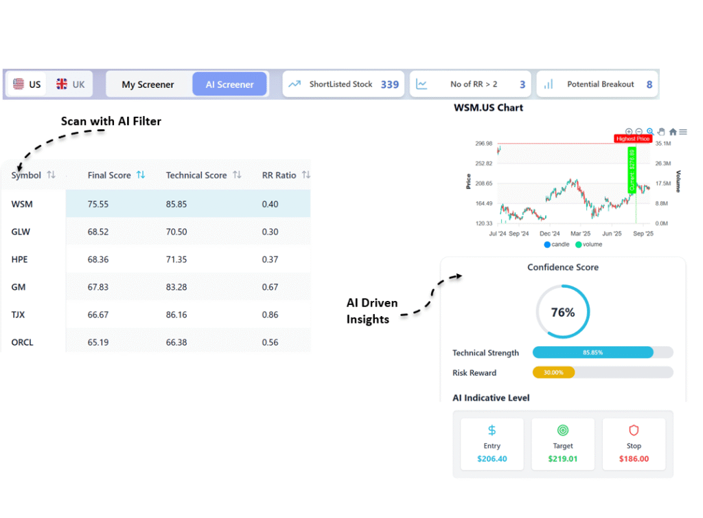 The biggest market moves aren’t driven by retail traders — they’re powered by institutions. Our AI Stock Picker looks past surface-level chart patterns to detect where institutional money is flowing. By combining sector strength, momentum confirmation, volume analysis, and risk–reward scoring, we highlight the setups most likely backed by real buying power.